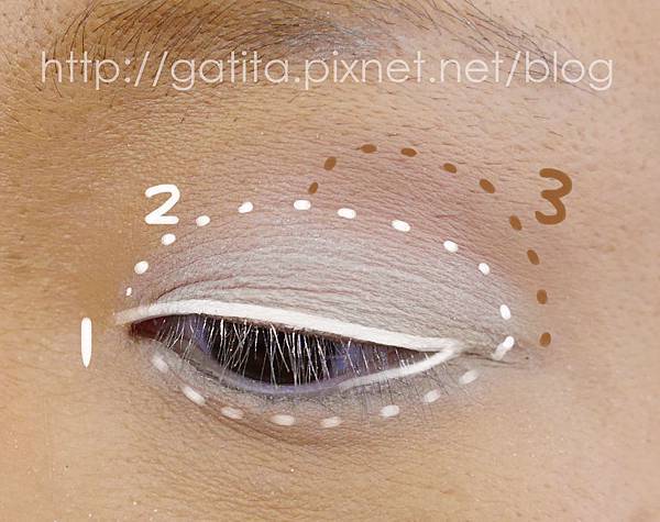 3. 咖啡色眼影在眼窩處暈染,讓白色更明顯